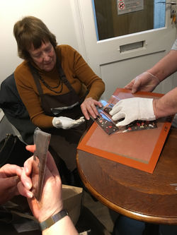 July saw the first of 2 Butterfly visits to the Dorking Caves. After our safety talk by one of our 3 guides ( all were very knowledgeable and charming ) we put on our hard hats and were allowed into the caves, which date back as far as the 17th century, but could even be older. Our entrance was beside the war memorial, the original entry was believed to be from the grounds of Butter Hill House. The caves are on 2 levels, and in great condition if not a little low in places. They were dug by hand using pickaxes - traces of the channeling can be seen in the roof. The first tunnel we entered was divided up into bins which stored wine, 700 bottles, right up until the early 1960's. Passing through another tunnel which used to store port in the past. We saw remains of very old broken glass bottles and some very fine pieces of early porcelain from China. We then made our way down several flights of stairs passing deep well shafts into what was called the mystery chamber - a small circular space with a bench around the edge cut out of the lower greensand stone. This was thought to be a secret meeting place,or a folly, no one knows for sure. Throughout the caves we saw extensive graffiti , mainly from the 18th and 19th centuries, but the oldest date recorded was from 1666.